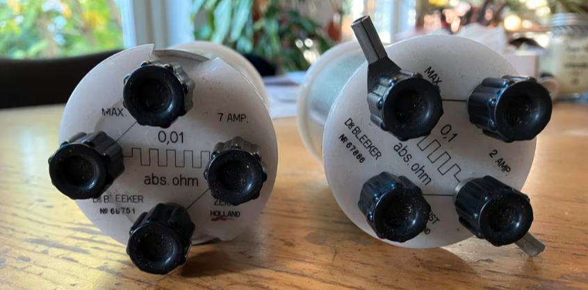 I recently found two vintage Bleeker precision resistors on Marktplaats: a 0.1 Ω ±0.01% and a 0.01 Ω ±0.01% model. After some doubt I had to get them, Bleeker to me feels like a long gone pinnacle of Dutch engineering. Verifying a 0.01% tolerance at such low resistance values is challenging — an error of just 1 mV at 1 A already represents 100 ppm.